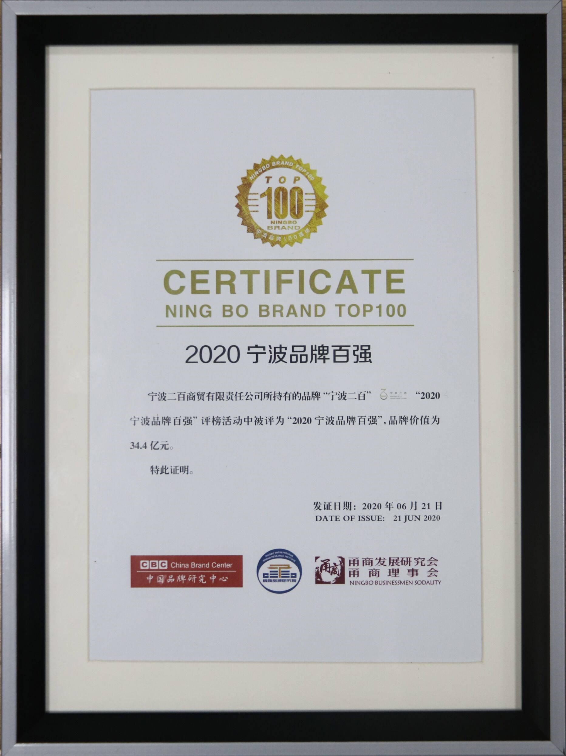 6月21日下午,在由“中國(guó)品牌研究中心”、“甬商發(fā)展研究會(huì)”、“甬商聯(lián)合會(huì)”聯(lián)合舉辦的“2020寧波品牌”授牌儀式上,我公司被授予“2020抗擊疫情寧波品牌”,寧波二百(公司全資子公司)被授予“2020寧波品牌百?gòu)?qiáng)”(二百品牌價(jià)值為34.4億元)!